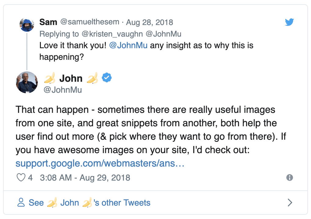 John Mueller stated on Twitter in August 2018 that “sometimes there are really useful images from one site, and great snippets from another”, nudging all those with “awesome images” in the direction of Google Image best practices, which makes sense.