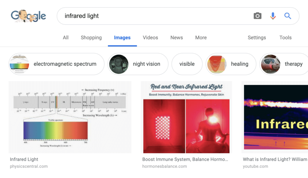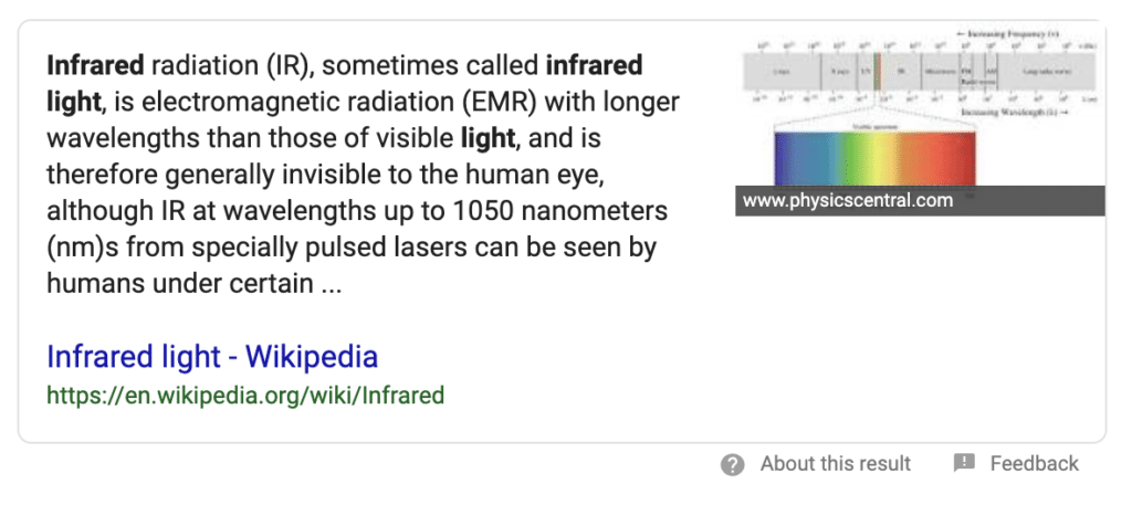 Despite the lack of image optimization, when comparing the page content and the image to the results that precede it, contextually, the image and the text content together provide the best summary of infrared light. Notably, you’ll see that in the suggested queries ‘electromagnetic spectrum’ is showcasing a near identical image.