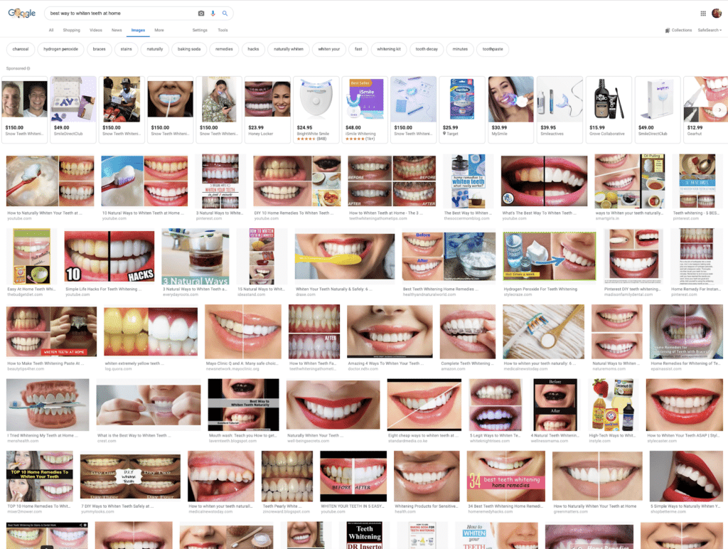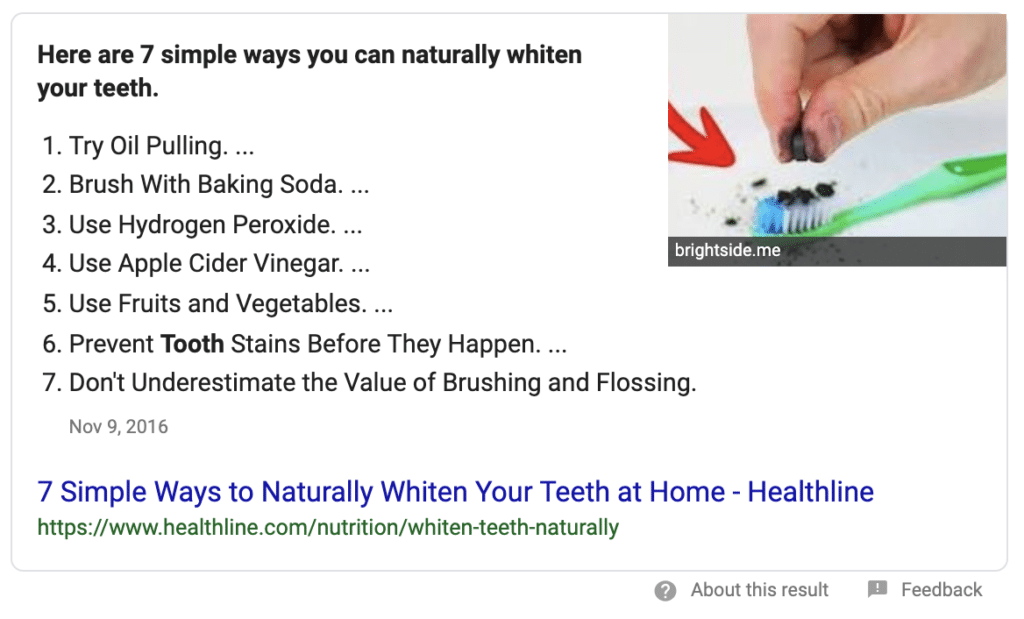 Let’s take a look at the suggestion for the search query “best way to whiten teeth at home”. As you can see below, the featured snippet displays someone placing charcoal onto a toothbrush: