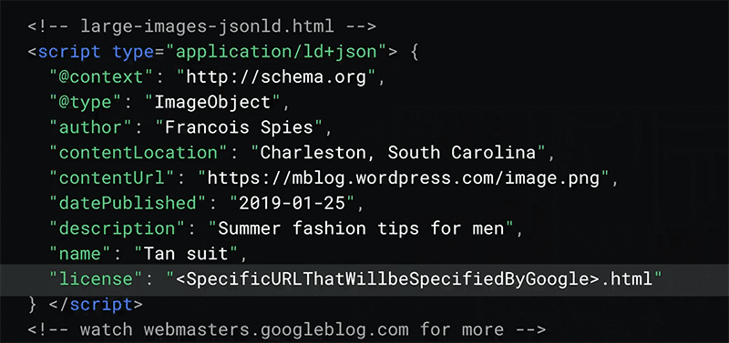 Google recently announced its High-Resolution Opt-In Program where you’ll be able to provide Google with a high-resolution image via semantic markup. Based on the screenshot below it appears that once you’ve opted-in to the program you’ll be able to assign a license property to the ImageObject schema: