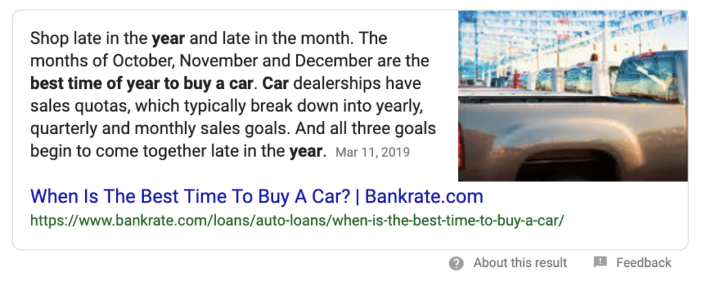 While I can understand the thought process of sending the user to a more image-centric page with more images to choose from, this doesn’t feel like the optimal user experience. I don’t think that the intent for someone searching on Google.com (i.e. not Image Search), and interacting with a featured snippet image always wants to be taken to an image search. Take the query “best time of year to buy a car” for example. There is no reason for me to want to see an enlarged version of this image: