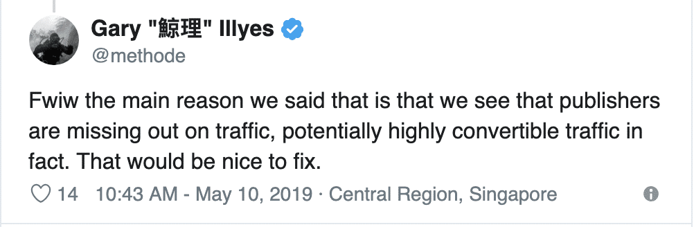 In January 2019, John Mueller stated that “images are (once again) gaining importance overall on the web” and Gary Ilyes, in response, said on Twitter that the main reason for this upcoming AMP feature was because they can see that publishers are missing out on traffic, and that it would be nice to fix: