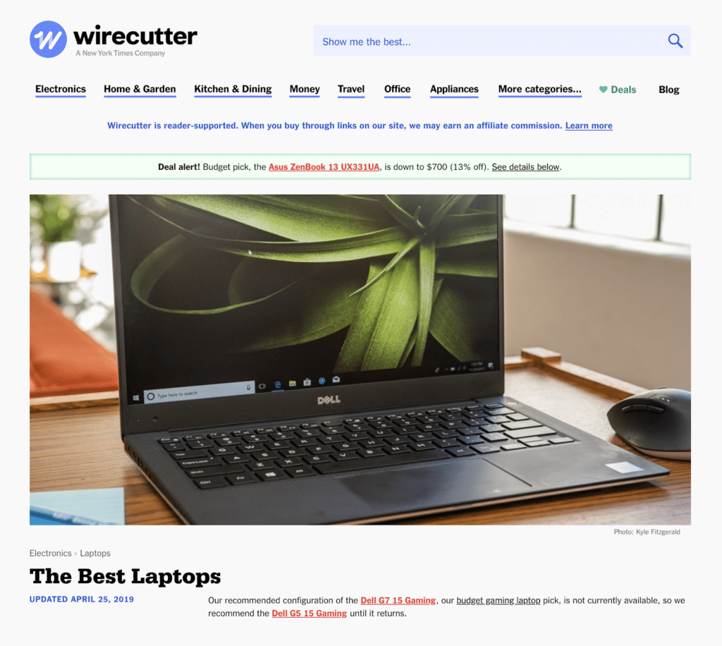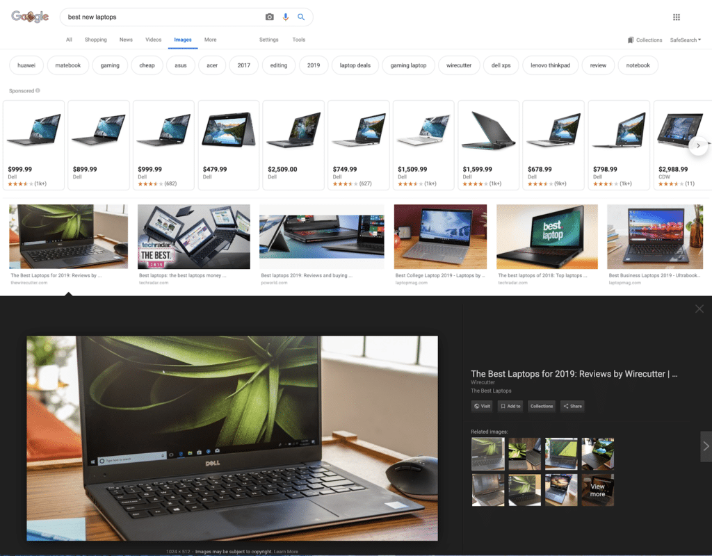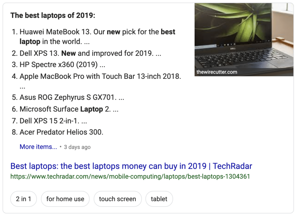 The query “best new laptops” yields many pages targeting “2019”, as you’d expect. With that in mind, the dateModified markup could be an additional factor to take into consideration for this particular query, considering that the topic that has a high focus on freshness. It is worth noting here that WordPress does assign the date to image URLs by default (check out the image URLs in the block of code from Wirecutter above: /2018/05/). So even though you may update an article with newer information, the images might be considered outdated. I can’t say for certain how much of a factor this might be in general, but for particular search queries where freshness is more important, I wouldn’t rule it out.